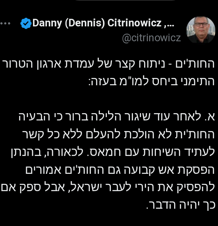 متابعات../ نشر الباحث الصهيوني المختص في شؤون الشرق الأوسط وإيران” داني دينيس” تحليلاً وصفه بالموجز لموقف جماعة “الحوثيين” من مفاوضات غزة من المنظور “الإسرائيلي”. ووفق الكاتب الصهيوني فإن مشكلة “الحوثيين” لن تزول تمامًا عن إسرائيل، أيّاً كانت نتائج الحرب في غزة ، لذا ثمة حاجة إلى وضع استراتيجية طويلة المدى للتعامل مع هذا العدو أي […]