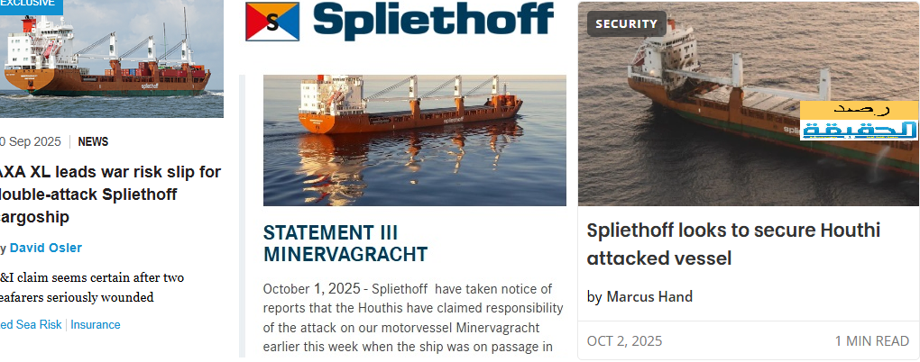 قالت شركة “سبليثهوف”  الهولندية المالكة لسفينة (مينرفاغراخت) التي أعلنت القوات المسلحة اليمنية في الــ30 من سبتمبر عن استهدافها في خليج عدن بسبب انتهاك الشركة المالكة لها حظر التعامل مع الموانئ الإسرائيلية إنها تسعى لسحب السفينة التي يقدر  قيمة هيكلها بحوالي 30 مليون دولار حسب قائمة لويدز ليست البحرية ومنصة  “lloydslistintelligence “ المختصة في مجال القانون البحري […]