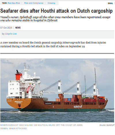 متابعات..|   قالت مجلة لويدز المتخصصة في الشؤون الملاحية ان أحد أفراد الطاقم اللذين نُقلا إلى المستشفى بعد الهجوم الحوثي الأسبوع الماضي على السفينة مينرفاغراخت التي ترفع العلم الهولندي توفي متأثرًا بجراحه.   وأكدت شركة سبليثوف جروب، مالكة السفينة، الخبر في بيان لها أن وفاة البحار الذي يحمل الجنسية الفلبينية “في المستشفى متأثرًا بإصابته الخطيرة […]