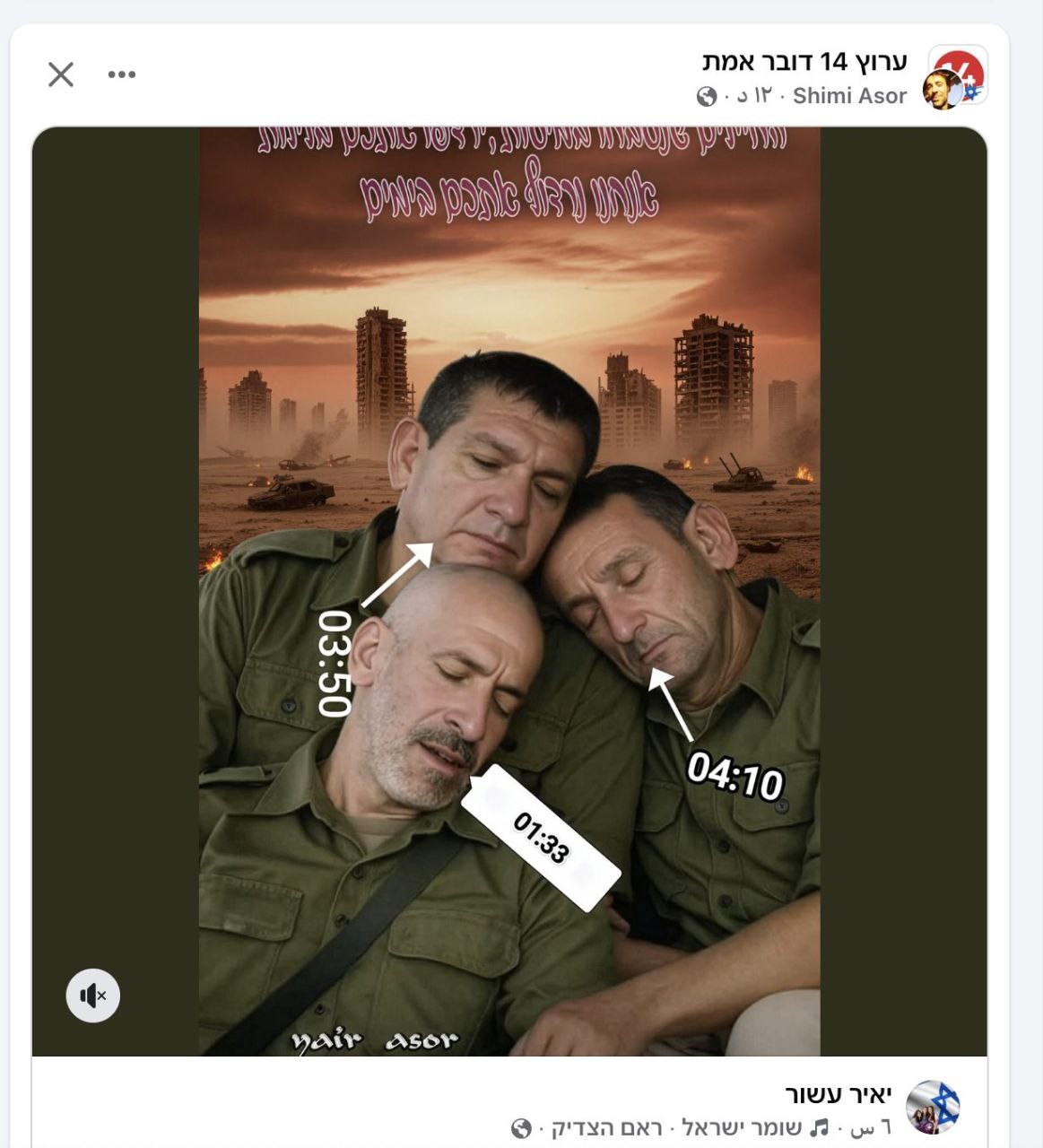 يسند أحدُهم رأسَ الآخرَينِ.. القناةُ الـ 14 العبرية -القريبة من المجرم نتنياهو- تنشُرُ صورة لقائد هيئة الأركان السابقة للاحتلال ورئيس الشاباك السابق ورئيس الاستخبارات العسكرية وهم نيامٌ في ليلة هجوم السابع من أُكتوبر. في محاولة يائسة لتبرئة من تطلق عليه (بيبي) تلطُّفًا وتحبُّبًا من الفشل صبيحةَ السبت الكبير إبَّان انطلاق طوفان الأقصى.
