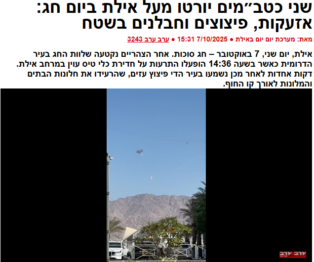 قالت صحيفة ” .yomyom -يوم يوم” إن اختراقات الطائرات المسيّرة اليمنية لأجواء مدينة إيلات، الثلاثاء، تسببت بحالة ذعر واسعة بين السياح والزوار الذي كانوا يقضون عطلة في المدينة السياحية. وكان جيش العدو الإسرائيلي أعلن أن أربع طائرات مسيّرة تسللت إلى أجواء المدينة في غضون ساعة واحدة تقريباً، ما أدى إلى تفعيل صافرات الإنذار مرات متوالية وإطلاق […]
