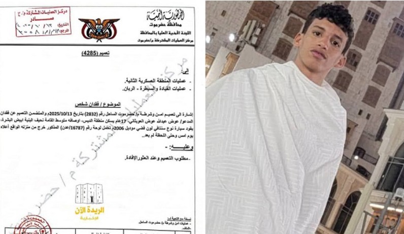 وكانت أسرة العوبثاني قد قالت في بيان ان ابنها “عوض عبدالله بن عوض البوري العوبثاني” – 17 عاماً اختفي منذ 12 أكتوبر، موضحة ان آخر تواصل مع نجلها كان في تمام الساعة التاسعة مساءً من يوم الأحد، الموافق 12 أكتوبر الجاري، أثناء تواجده في حي الديس بمدينة المكلا، قبل أن ينقطع الاتصال به منذ ذلك الوقت.