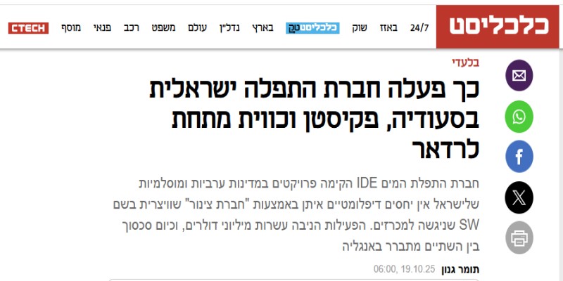 متابعات..| كشفت تحقيقات صحفية أن شركةٌ تابعة لكيان الاحتلال الصهيوني -متخصصة في تحلية المياه- تُدعى “IDE”، اخترقت على مدى العقد من الزمن دولًا عربية وإسلامية -من بينها السعوديّة وباكستان والكويت- واستحوذت على مشاريع ضخمة، من خلال آلية تمويهية تعتمد على شركة وسيطة مقرّها سويسرا. وبحسب معلومات نشرتها صحيفة “كالكاليست” الاقتصادية الإسرائيلية، فإن الشركة (إسرائيلية)، التي […]