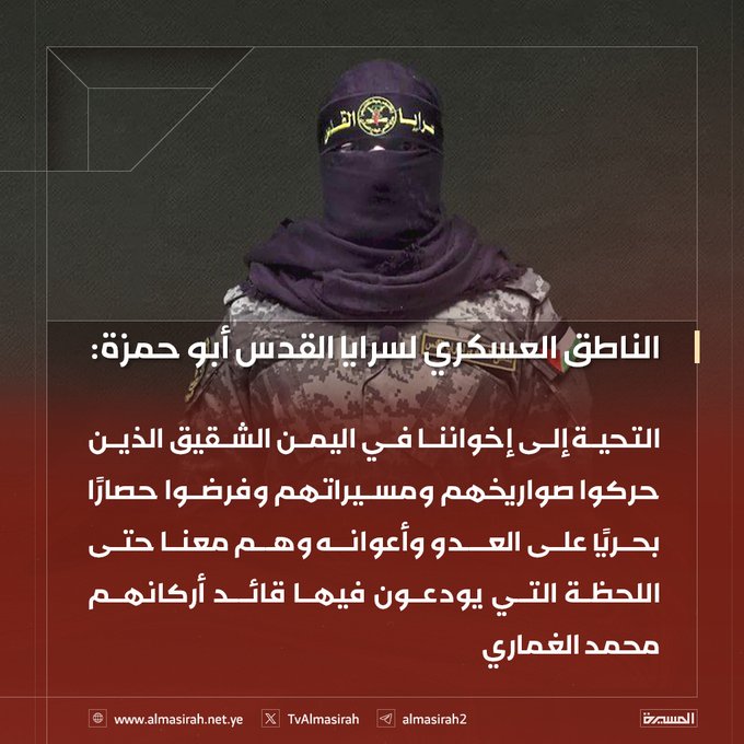 الناطق العسكري باسم سرايا القدس :التحية لليمنيين الذين حاصروا العدو المجرم وهم معنا حتى اللحظة التي يودعون فيها قائد أركانهم