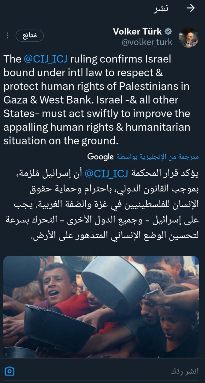 مفوض الأمم المتحدة: “إسرائيل” ملزمة بتنفيذ قرار محكمة العدل الدولية بشأن حماية حقوق الفلسطينيين في أكتوبر 23, 2025 شارك أكتوبر 23, 2025 نيويورك | وكالة الصحافة اليمنية الذهاب إلى المصدر شارك FacebookTwitterGoogle+ReddItWhatsAppPinterestالبريد الإلكتروني